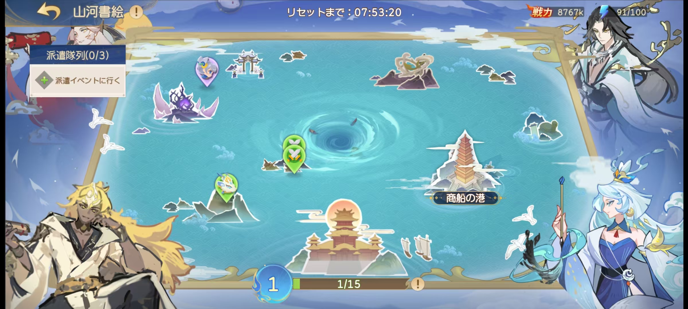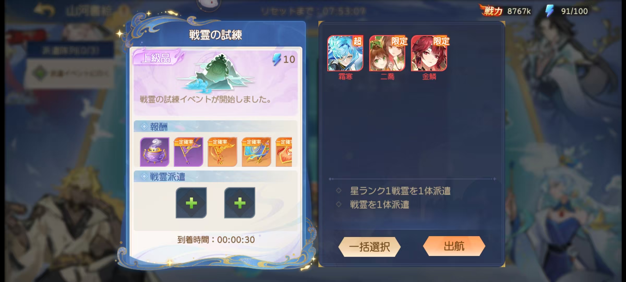 「山河書絵」では、コンテンツ専用の行動力を消費して、条件を満たした戦霊・霊騎・荒神を派遣する、または自身で戦闘することができ、