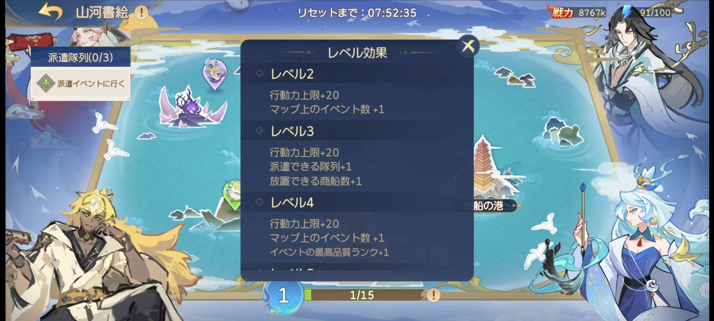 完了数が増えるにつれ、「山河書絵」のレベルも上昇し、派遣隊列の上限も拡張されます。