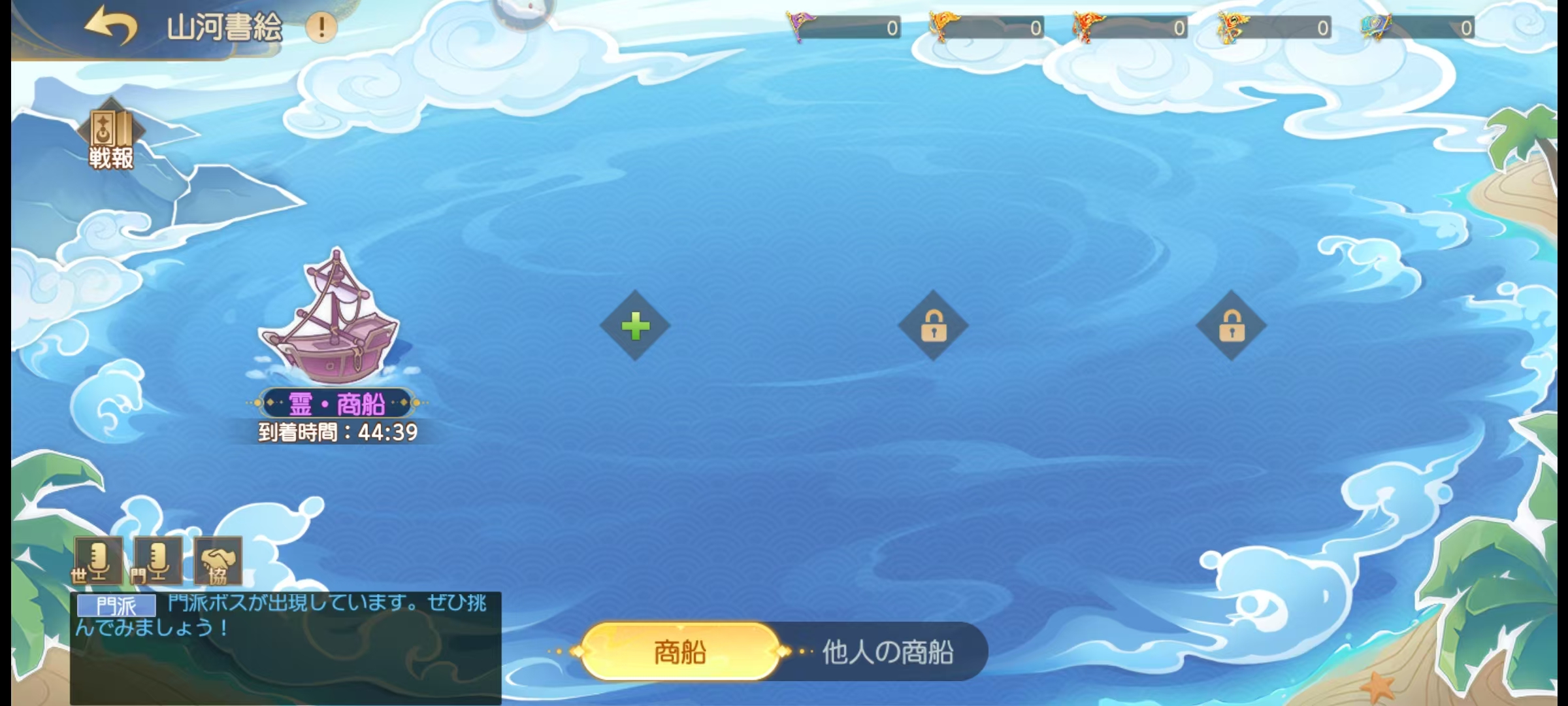 「山河書絵」メイン画面の右側にある『商船の港』をタップすると、商船イベント画面に移動できます。